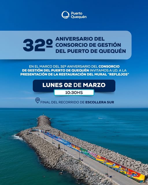 En el marco de un nuevo aniversario del Consorcio de Gestión del Puerto de Quequén, este lunes 2 de marzo a las 10:30 horas se llevará a cabo la presentación de la restauración del mural “Reflejos”, emplazado al final del recorrido de la Escollera Sur de Puerto Quequén.