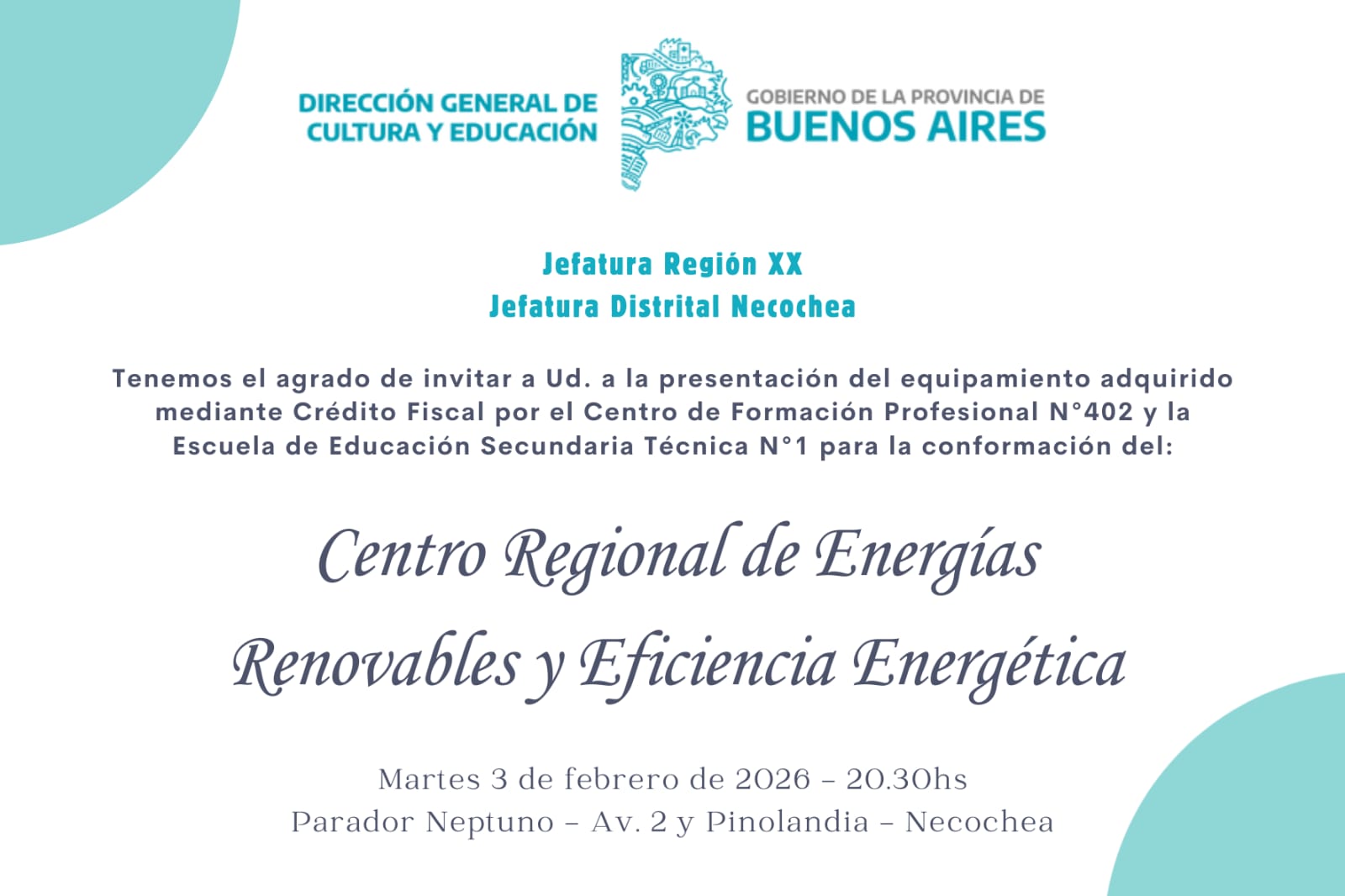 Este martes será un día fundamental para el desarrollo de las energías limpias en nuestra ciudad. A las 20:30 hs, en las instalaciones del Parador Neptuno, se llevará a cabo la presentación oficial del equipamiento técnico destinado a la conformación del Centro Regional de Energías Renovables y Eficiencia Energética.